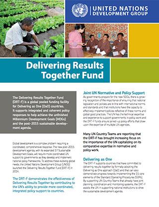 The Delivering Results Together Fund (DRT-F) is a global pooled funding facility for Delivering as One countries. It supports integrated and coherent policy responses to help achieve the unfinished Millennium Development Goals and the post-2015 sustainable development agenda.