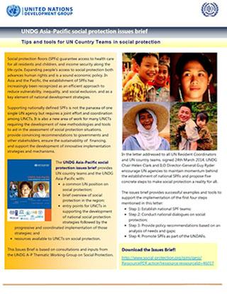 Breadcrumb Home / Resources Library / UNDG Asia-Pacific Social Protection Issues Brief Resource UNDG Asia-Pacific Social Protection Issues Brief December 2014 Tips and tools for UNCT teams in social protection. English File type: PDF Downloads: 1107